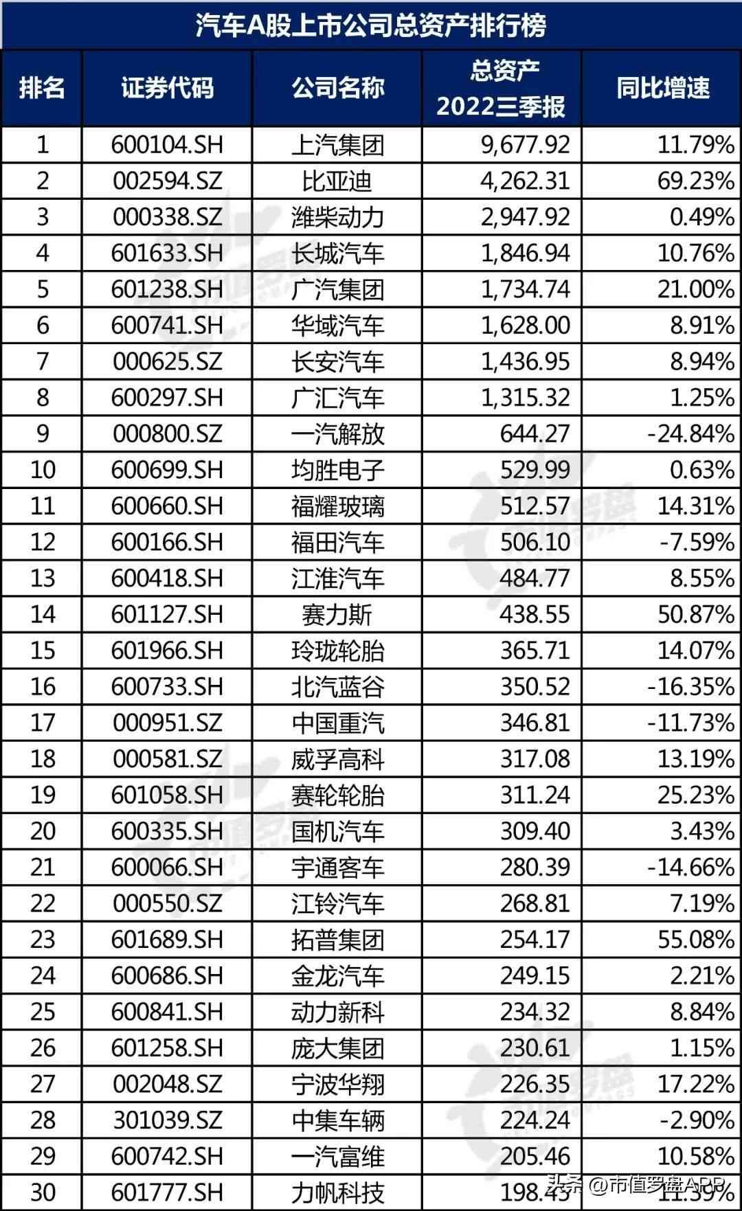 其中,1家汽车行业A股上市公司总资产规模超过5亿。榜单前三发生改变,上汽集团(9677.92亿元)保持排名第一,比亚迪(4262.31亿元)代替潍柴动力排名第二,潍柴动力(2947.92亿元)退居第三。