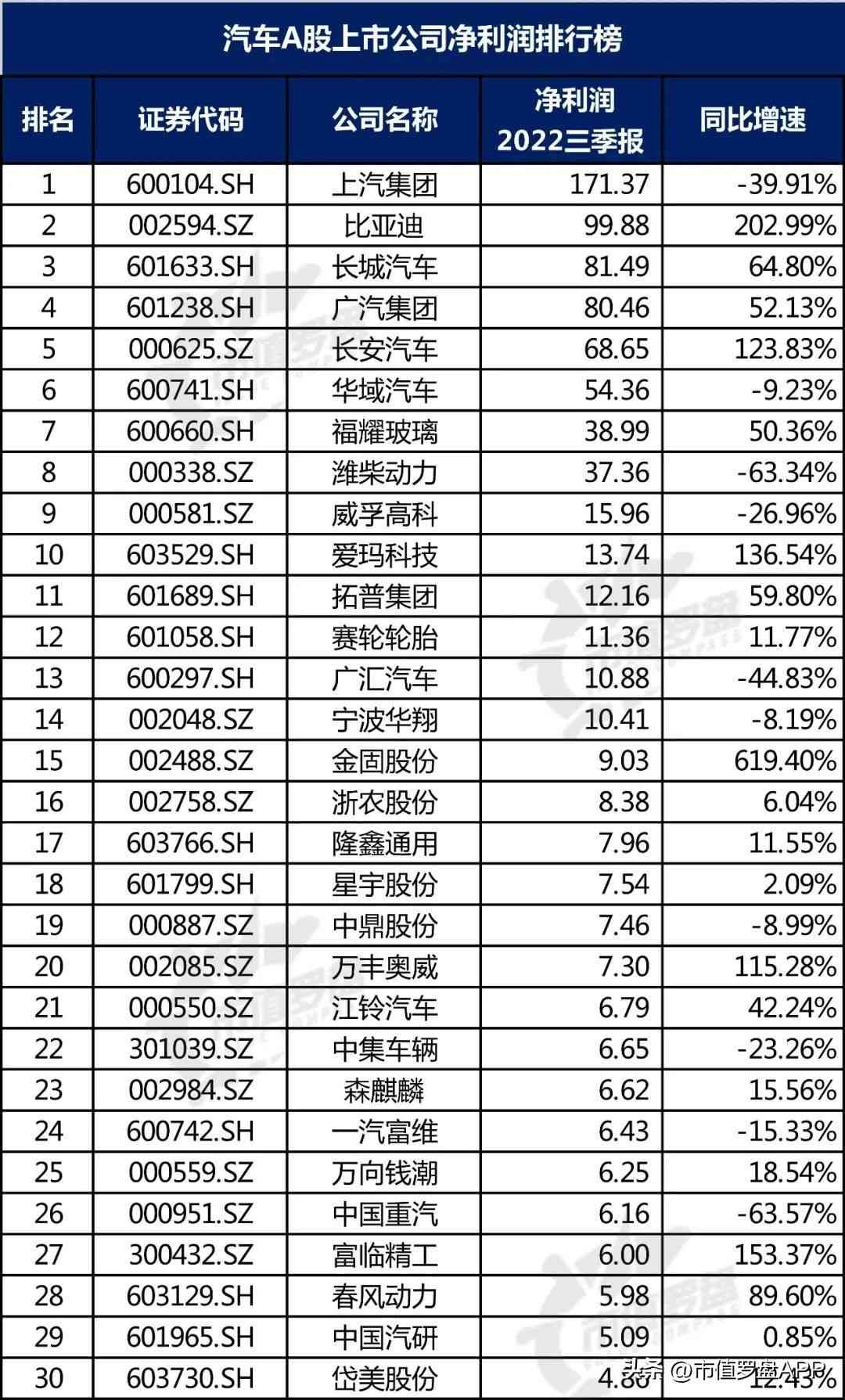 其中,1家企业净利润规模突破1亿元。榜单未发生改变。2022前三季净利润第一名是上汽集团(171.37亿元),第二名是比亚迪(99.88亿元),第三名是长城汽车(81.49亿元)。