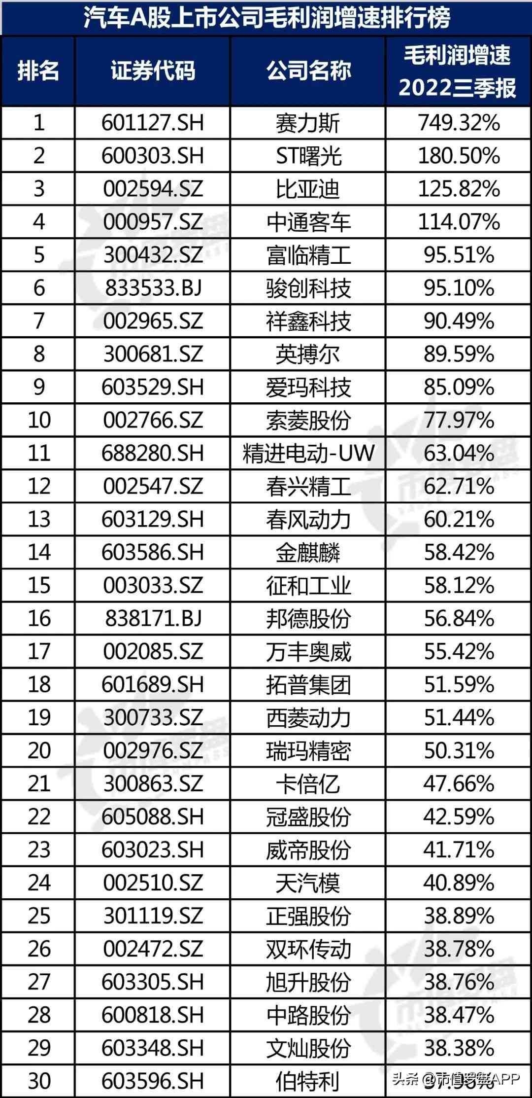 图7:汽车行业A股上市公司毛利润增速排行榜
