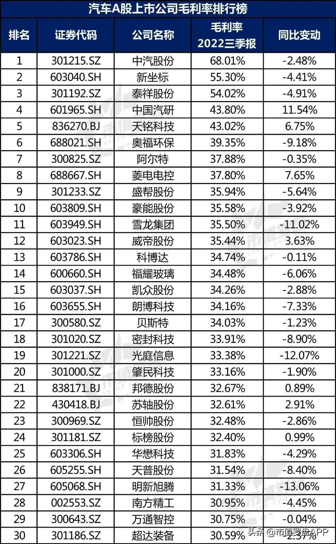 2022前三季汽车行业A股上市公司中毛利率超过50%的有3家。其中,榜单前三未发生改变,中汽股份(68.01%)排名第一,新坐标(55.30%)排名第二,泰祥股份(54.02%)排名第三。较去年同期,68家公司毛利率改善,188家毛利率下滑。