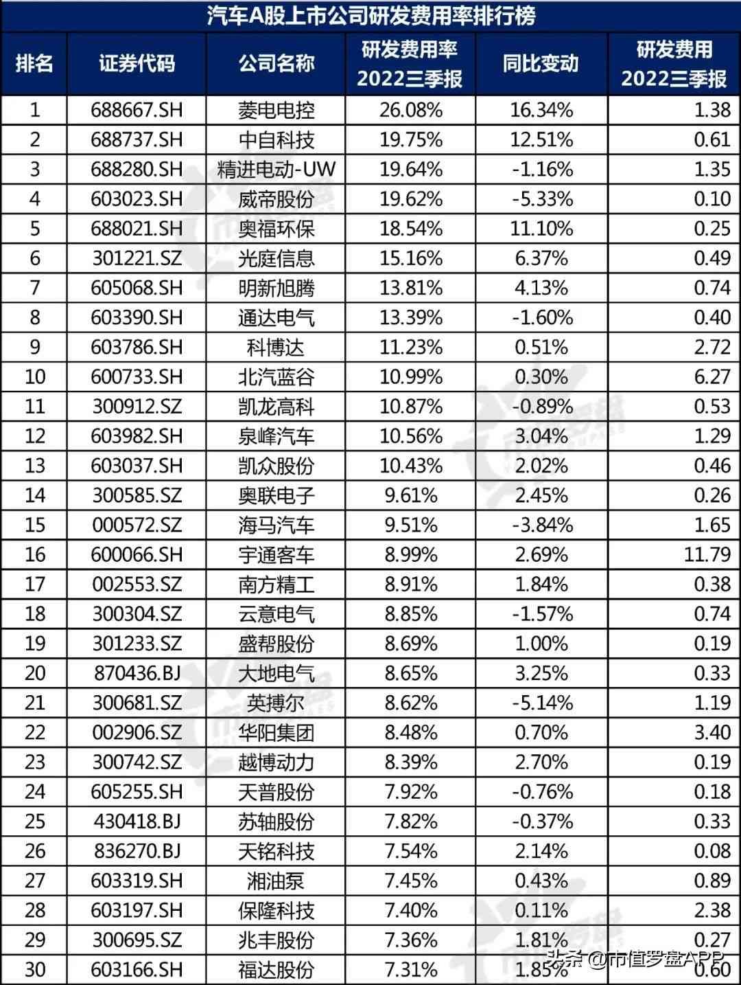 2022前三季汽车行业A股上市公司研发费用规模前三为上汽集团(126.64亿元)、比亚迪(108.70亿元)、潍柴动力(55.14亿元),研发费用率前三为菱电电控(26.08%)、中自科技(19.75%)、精进电动-UW(19.64%)。