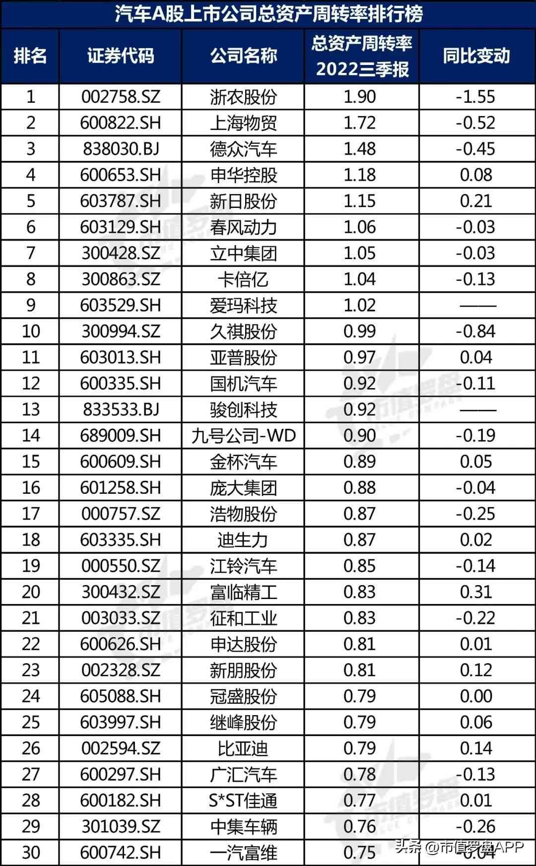 图13:汽车行业A股上市公司总资产周转率排行榜