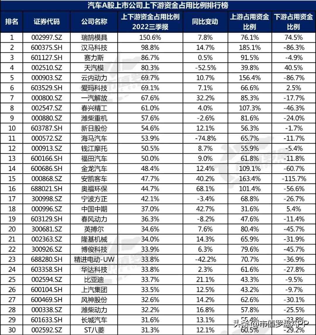 图15:汽车行业A股上市公司上下游资金占用比例排行榜