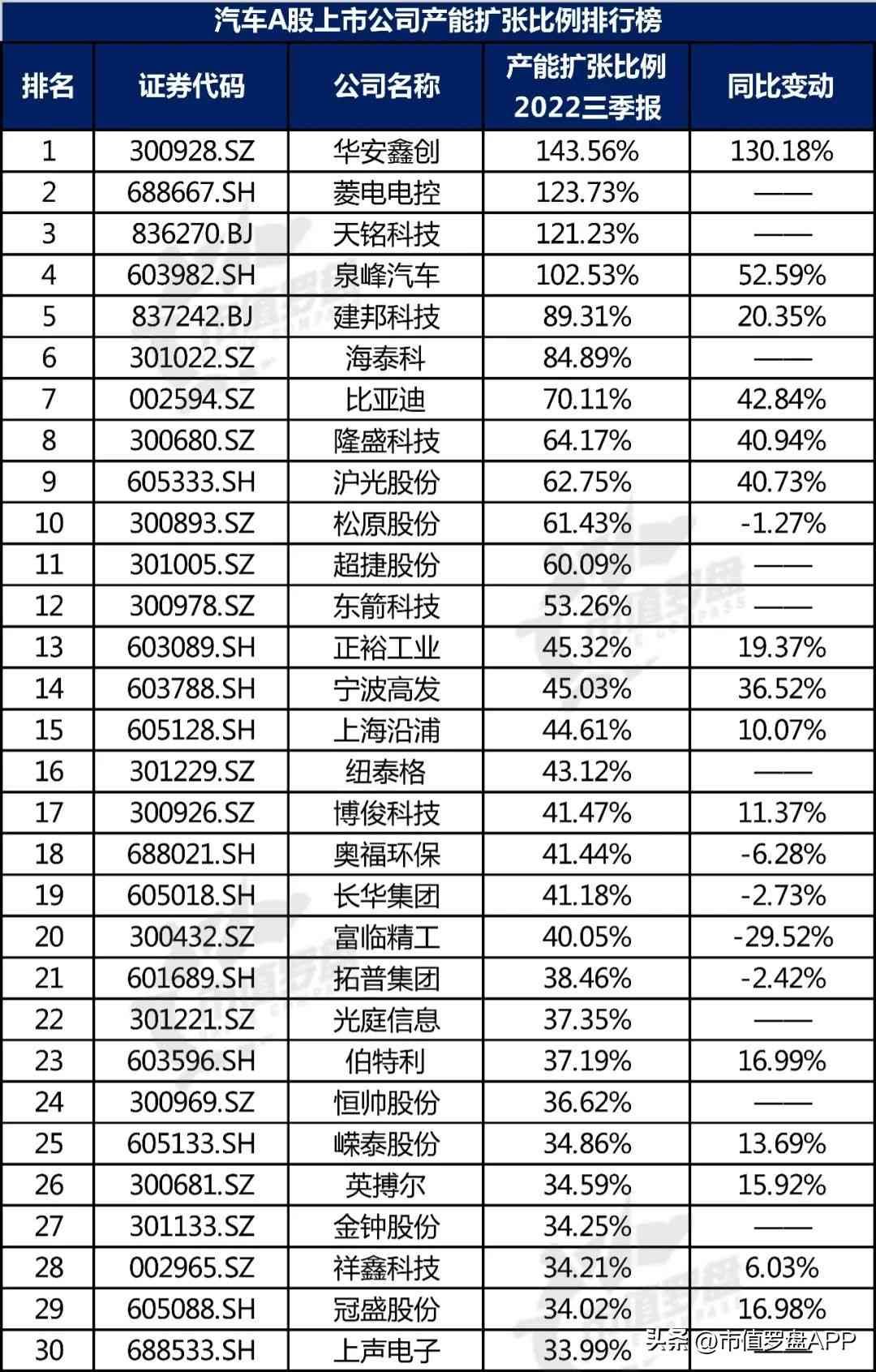 2022前三季汽车行业A股上市公司中有4家产能扩展比例大于1%。榜单前三发生改变,华安鑫创(143.56%)代替阿尔特排名第一,菱电电控(123.73%)代替富临精工排名第二,天铭科技(121.23%)代替建邦科技排名第三。