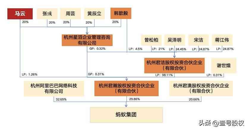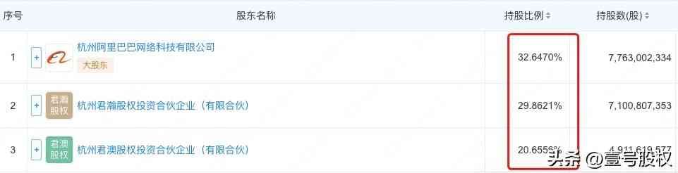 第二大股东是杭州君瀚股权投资合伙企业(有限公司),这是一个有限合伙企业,也是员工持股平台,这里值得说一下,有限合伙企业的决策权在GP,也就是普通合伙人或者管理合伙人,出钱较少,但是负责主事,是真正的话事人,LP是有限合伙人,主要负责出钱,没有决策权。杭州君瀚有限合伙企业的GP是杭州星滔企业管理咨询公司,该公司有五个自然人股东,五个股东均持有20%的股份,马云也是其中之一,相互之间没有一致行动人协议,所以是相互独立的,我们就可以理解为杭州星滔企业管理咨询公司是没有实际控制人的,是一个非常民主的股权架构,即便是马云,他也只是有20%的股权和话语权,新任CEO韩歆毅也持有20%的股份。