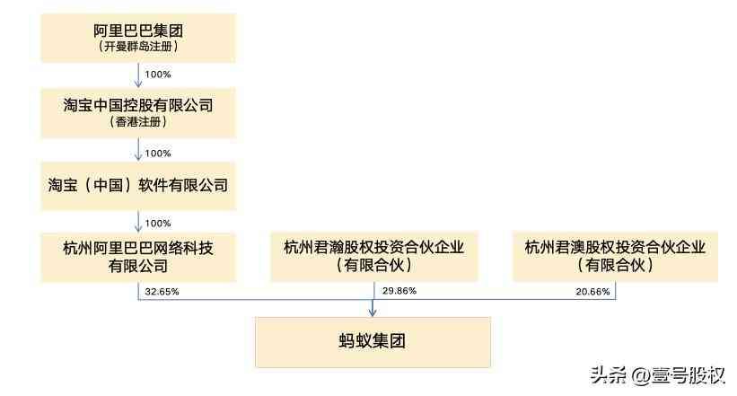 蚂蚁集团的第一大股东是杭州阿里巴巴网络科技有限公司,该公司是被淘宝(中国)软件有限公司1%持股的,后者又是被香港公司淘宝中国控股公司1%控股,香港淘宝是被开曼群岛注册的阿里巴巴集团1%控股的。现在上市的主体公司就是在开曼群岛注册的这个阿里巴巴集团。阿里巴巴集团的控制权比较复杂,不是看股份多少,而是集中在阿里巴巴合伙人制度,这个制度比较复杂,给予了阿里巴巴高级管理人员充分的权力,马云和蔡崇信是核心人物,对公司拥有无可比拟的影响力。