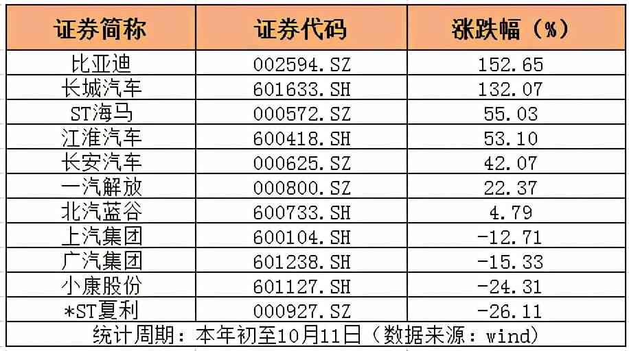 车企十大牛股出炉:比亚迪涨5.8倍长安16倍,上汽夺走涨幅王