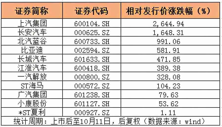 有两家车企上市后股价涨幅超过10倍,上汽集团虽然今年比较疲软,其累计涨幅超过或26倍,也是稳坐车企“涨幅王”宝座。长安汽车以大约16.5倍紧随其后。