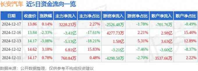 长安汽车(000625)12月17日主力资金净买入3228.23万元