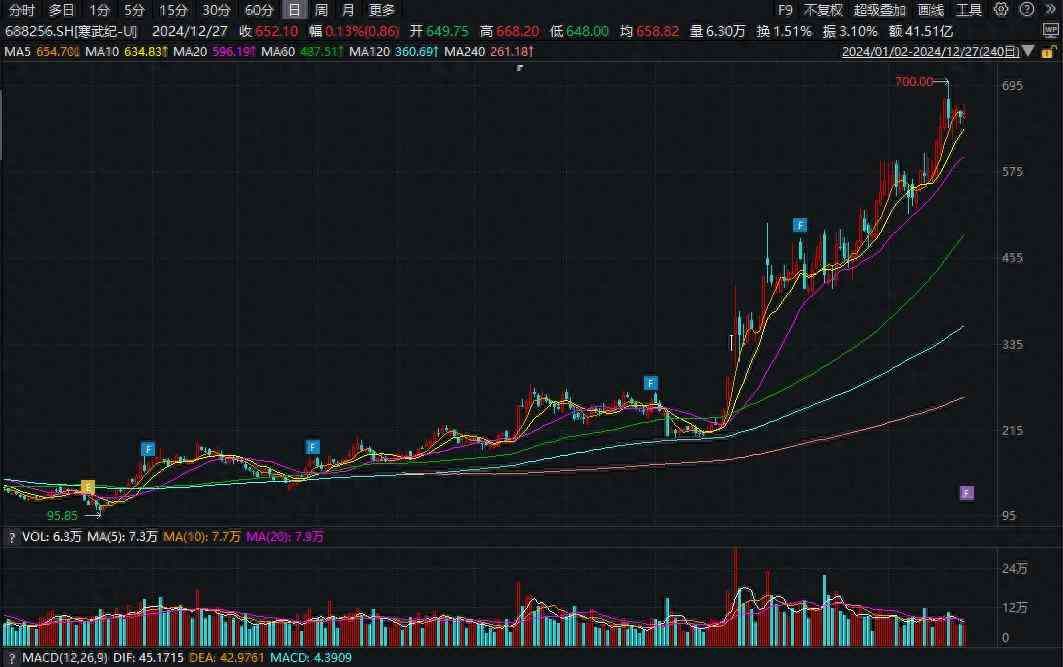 寒武纪-U股价还在创新高的过程中。年初,其股价134.96元/股,近期盘中一度触及7元/股,最新收盘价652.10元/股。如今,公司已成为A股市场上,仅次于贵州茅台(6519.SH)的高价股。