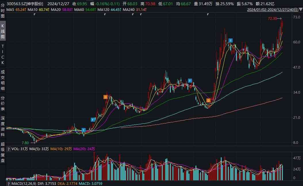 Wind数据显示,神宇股份2024年以来股价累积上涨342.16%,排名第三。公司股价自低价最大涨幅超过8%。