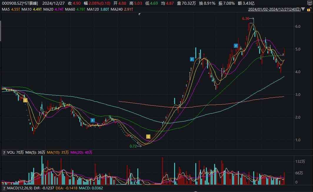 *ST景峰日K线六、*ST同洲:从濒临退市到大牛股*ST同洲在2024年期间经历了濒临退市到大牛股的反转。公司股价全年累积有79个交易日涨停,仅次于*ST景峰。全年股价累积涨幅244.85%。