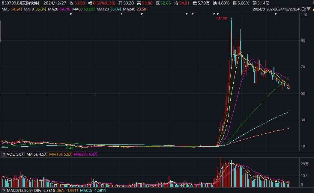 涨势凶,回调也猛。年内艾融软件股价最低值为8.45元/股,股价最高达107.元/股。公司最新股价53.50元/股,较高位刚好“腰斩”。