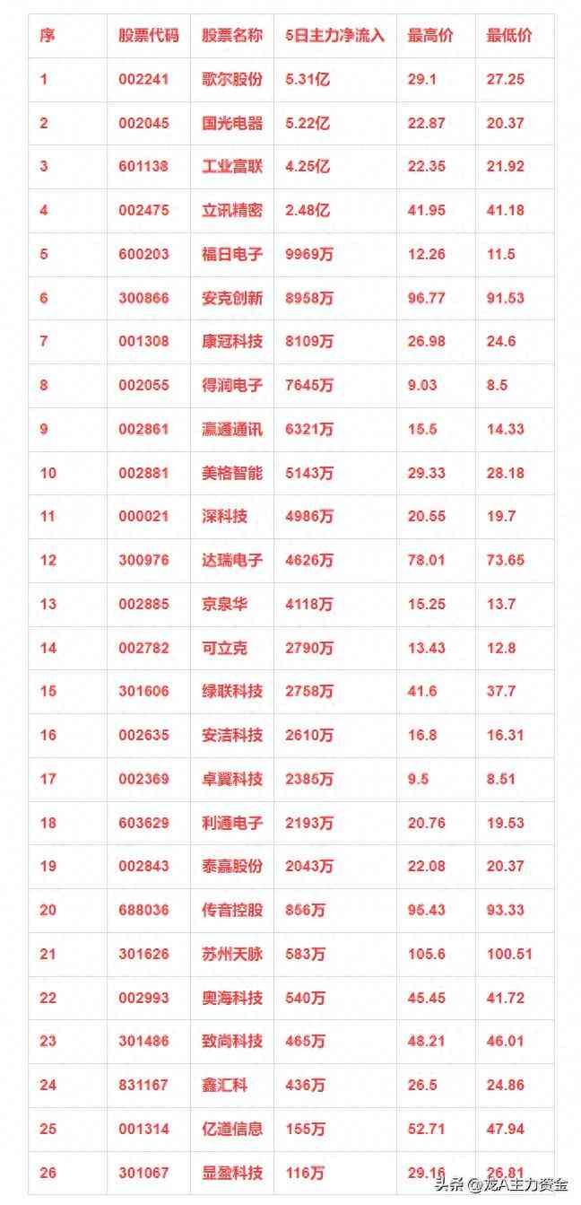 消费类电子龙头股票,消费电子概念,本周主力资金净流入的26强个股!