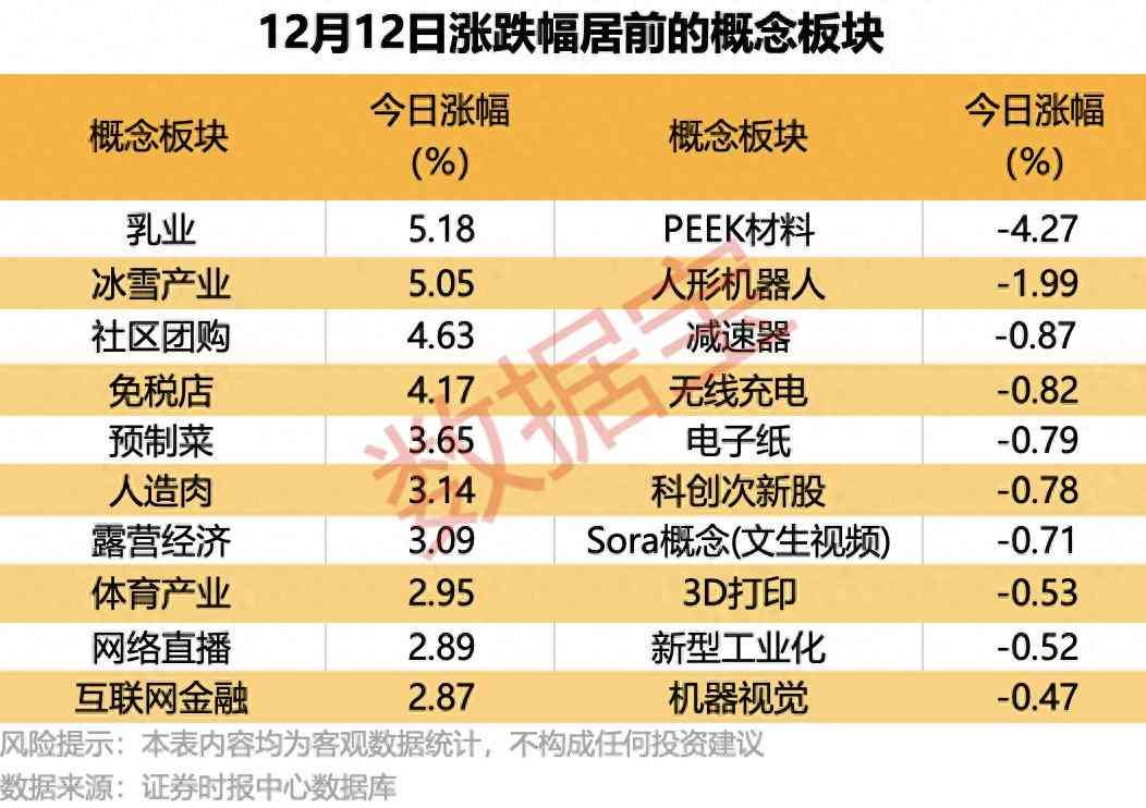 盘面上,乳业、冰雪产业等消费概念同样领涨,收盘均涨逾5%。乳业股中,熊猫乳品再度“20cm”涨停,均瑶健康、维维股份等尾盘拉升至涨停。冰雪产业概念晶雪节能“20cm”涨停,莱茵体育、雪人股份、大连圣亚等涨停。此前连续强势的PEEK材料、人形机器人等今日出现调整。