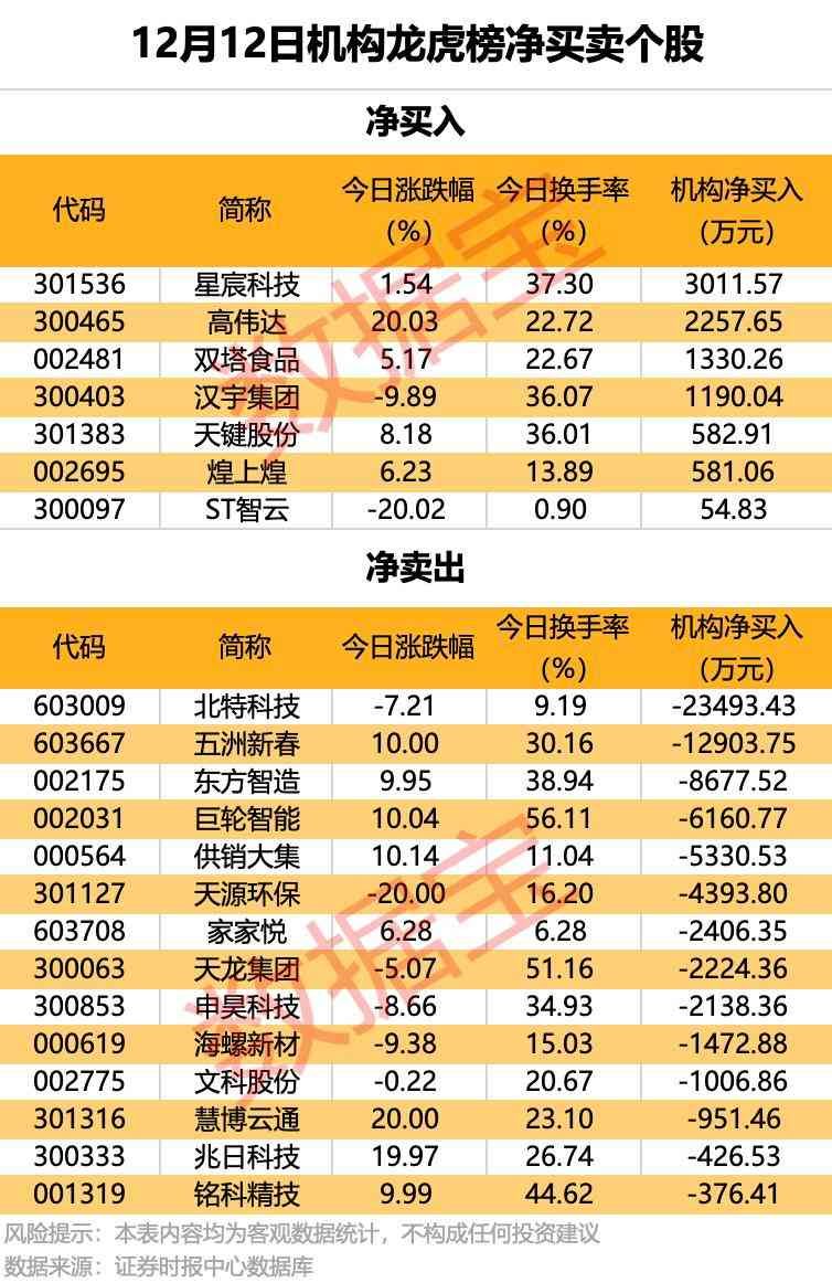 12月12日龙虎榜中,机构净买入的个股有7只,净买入金额居首的是星宸科技,机构净买入金额3012万元。