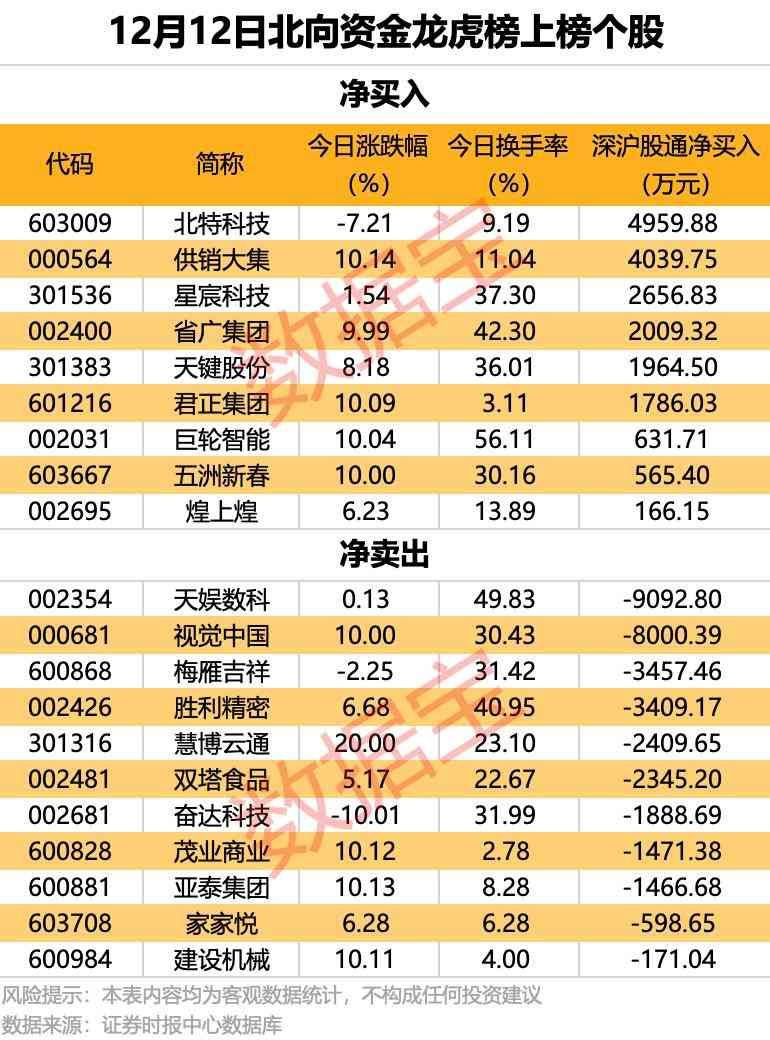 龙虎榜上,北向资金今日净买入9股,净买入金额最多的是北特科技,北向资金净买入4960万元。北向资金净卖出最多的是天娱数科,净卖出金额9093万元。