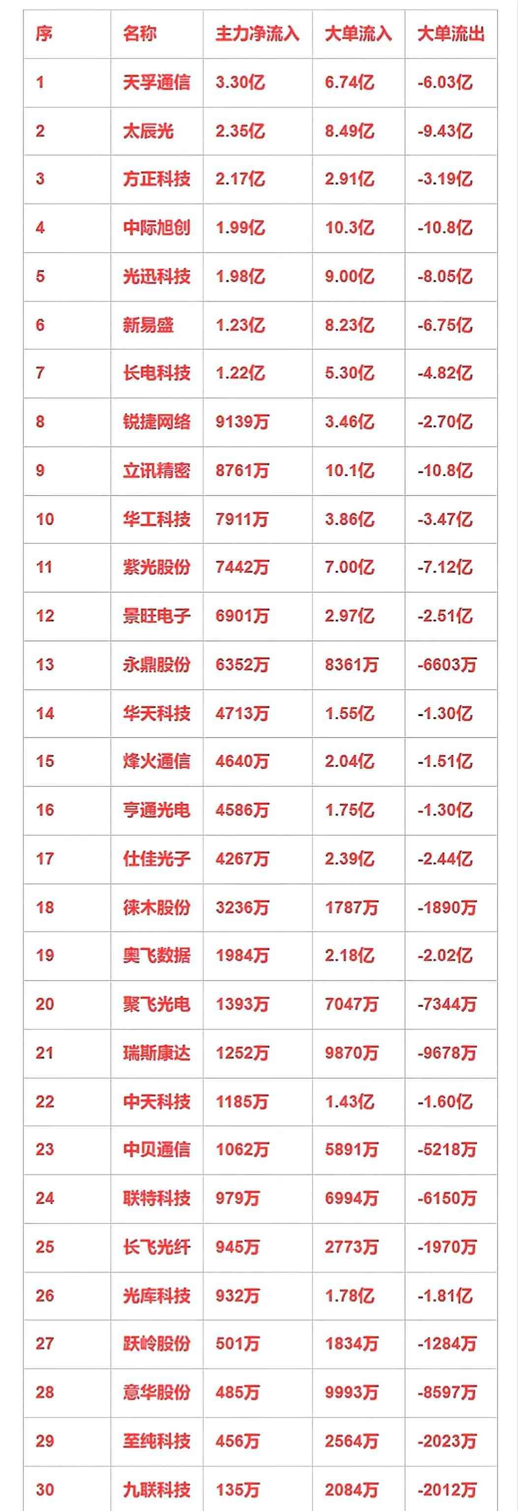 光迅科技(1.98亿)和中际旭创(1.99亿)等公司主力资金流入明显,这可能与市场对光通信技术在数据中心和高速网络中应用的增长预期有关。