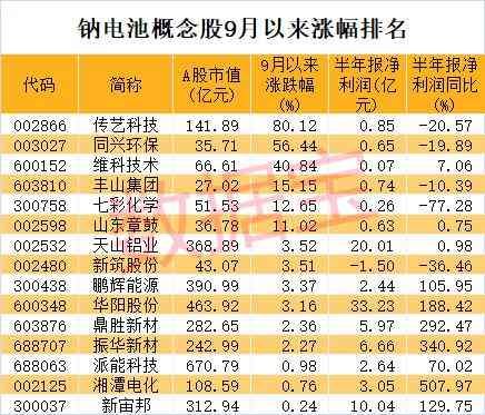 按照估值水平来看,截至9月26日收盘,上述高增长潜力的钠电池概念股中,六成股票滚动市盈率低于40倍。市盈率最低的是多氟多,公司滚动市盈率12.7倍。上半年公司实现盈利14.03亿元,同比增长355.54%,净利润创同期历史最佳水平。