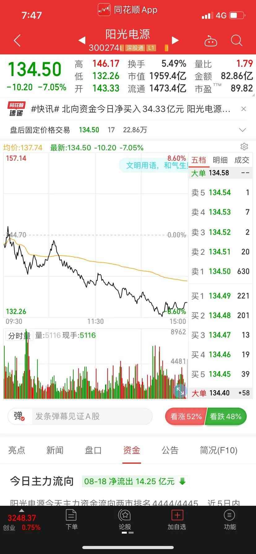 4.阳光电源,代码3274。最新股价134.50元每股,市值1959.39亿元。