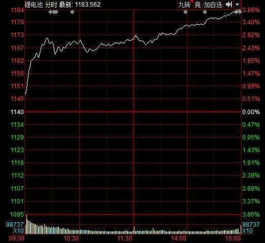 7月5日,受三季度消费锂电旺季临近消息影响,锂电池板块强势爆发,截至收盘,该板块指数上涨3.86%,板块内久吾高科、天华超净、华自科技、金银河、康盛股份、圣阳股份、安纳达、国光电器、西藏城投、西藏矿业、成飞集成、鞍重股份、雅化集团、盛新锂能、赣锋锂业、永兴材料、融捷股份、中矿资源、科达制造、科瑞技术、江特电机、凤凰光学、沧州明珠等20余股涨停,其他个股纷纷跟涨。
