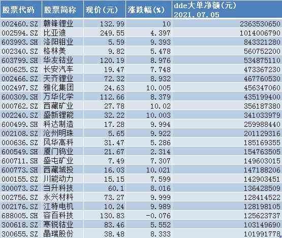 7月5日大单资金净流入额超亿元的锂电池概念股: