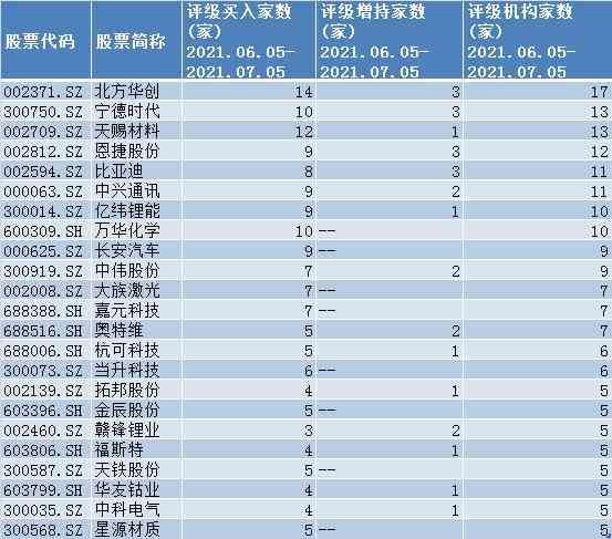 从机构评级来看,近30天共有23只个股获得了5家以上机构扎堆看好,给予了“买入”或“增持”的积极评级。其中,北方华创(17家)、天赐材料(13家)、宁德时代(13家)、恩捷股份(12家)、中兴通讯(11家)、比亚迪(11家)、亿纬锂能(10家)和万华化学(10家)等8 家公司更是获得10家或以上的机构青睐。