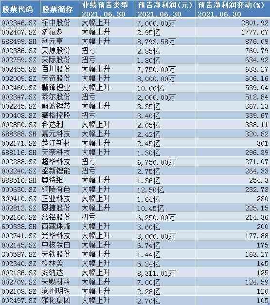 中报业绩有望翻番的锂电池概念股: