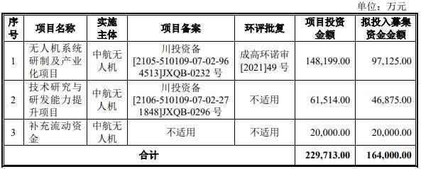 中无人机实际募资净额比原拟募资多255,705.72万元。公司2022年6月21日披露的招股书显示,中无人机原拟募资164,.万元,拟分别用于“无人机系统研制及产业化项目”、“技术研究与研发能力提升项目”、“补充流动资金”。