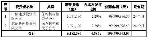 保荐机构依法设立的另类投资子公司中信建投投资有限公司及航证科创投资有限公司跟投数量分别为本次公开发行股份数量的2.29%,即309.1190万股,合计跟投比例为本次公开发行股份数量的4.58%,即618.2380万股;获配金额分别为1亿元,合计2亿元。本次跟投获配股票的限售期为24个月。