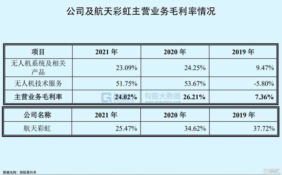 报告期内,公司主营业务毛利率分别为7.36%、26.21%和24.02%,毛利率水平波动较大。2019年公司刚开展生产销售无人机系统业务,由于人员费用增加等各种因素,导致毛利率较低;而在步入正轨的2020年和2021年,公司的主营业务毛利率却由26.21%降至24.02%,且持续低于竞争对手航天彩虹(主打“彩虹”系列无人机),侧面反映出公司的议价能力不足,且成本管控能力较弱。