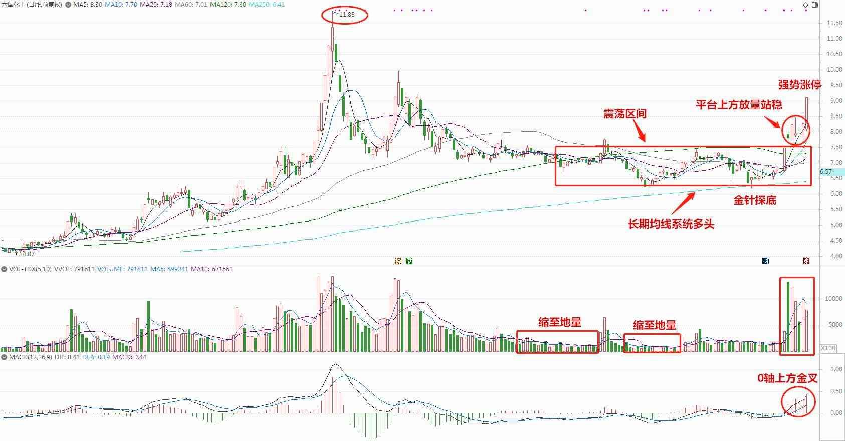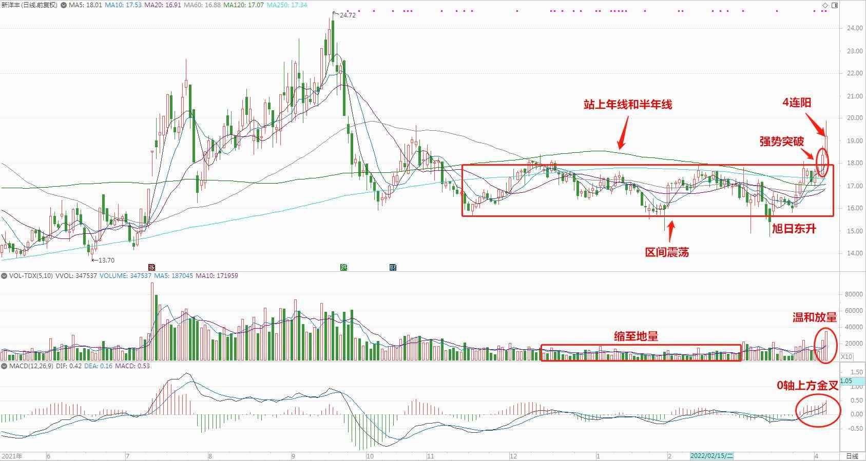技术分析:价格在低位震荡了近半年时间,量能逐渐缩至地量,近期强势突破盘整平台,同时走出4连阳的行情,量能温和放大,MACD位于0轴上方运行同时金叉,短期可以关注价格能否持续站稳平台,如此则有望重拾升势,建议加自选后仔细研究。