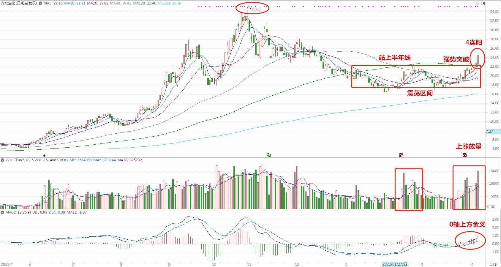 技术分析:价格在前期调整过程中量能持续萎缩,上涨时放量,近期强势突破震荡区间,同时站上半年线,MACD黄白线位于0轴上方金叉,可以考试关注后重点研究。