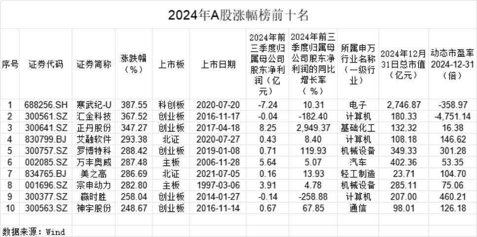 2024年的A股市场并不平静。众多股票经历了跌宕起伏的行情,从年初的急跌,再到9月底以来A股市场在政策刺激下出现了一波强劲上涨,市场热点频繁切换,红利、人工智能、芯片、华为产业链、低空经济等板块轮番演绎。Wind(万得)数据显示,剔除2024年上市的新股,2024年翻倍股数量达到94只,其中寒武纪(688256.SH)以387.55%的涨幅位居第一,汇金科技(3561.SZ)、正丹股份(3641.SZ)年内涨幅也超三倍。另外,还有艾融软件(830799.BJ)、罗博特科(3757.SZ)等17只个股累计涨幅超两倍。