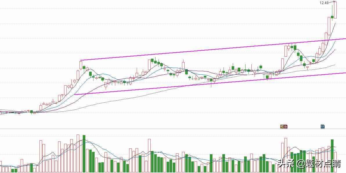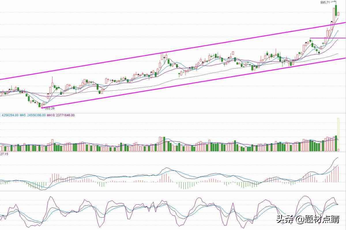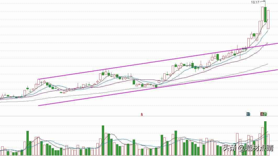 以上图表分析,股价经过一轮密集型放量上涨,并在上方形成一个上升通道,并在其通道中进行一段时间的震荡上涨,当前股价已强势突破通道上方压力线,并仍在强势且不断创新高中。笔者认为此时我们该做的是等待回调,或动用小仓位进行超短线交易,但我建议等待股价回调至通道上轨附近再进行介入,最后的风险控制线仍在在通道下轨。控制好风险!!