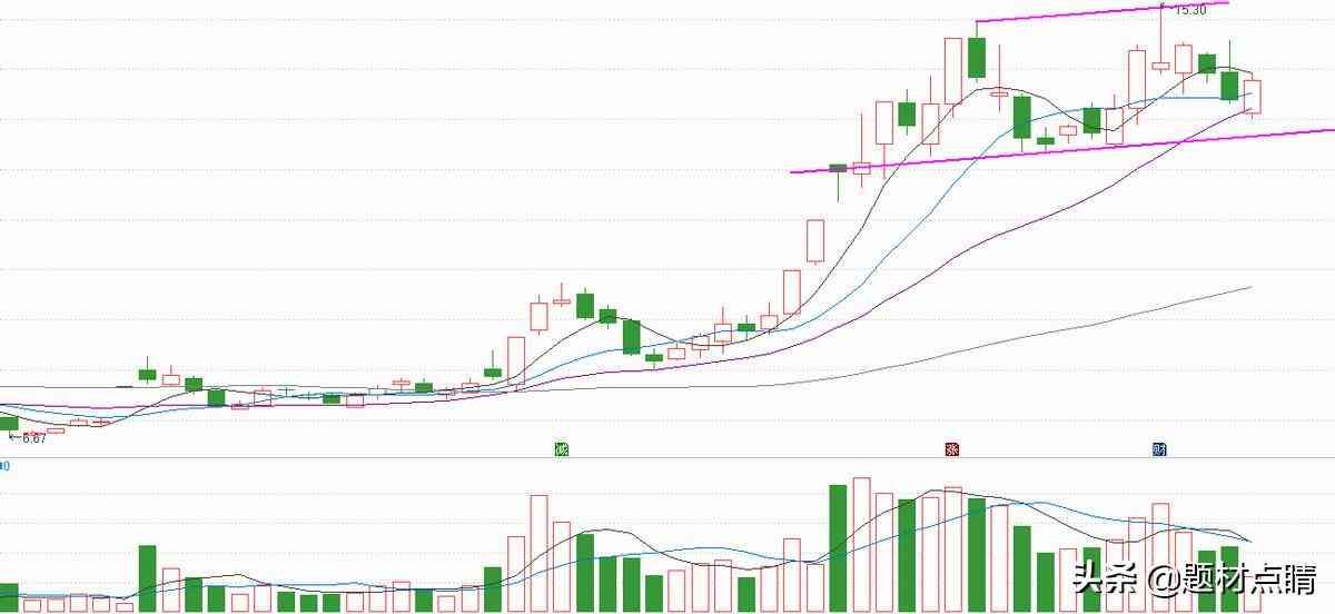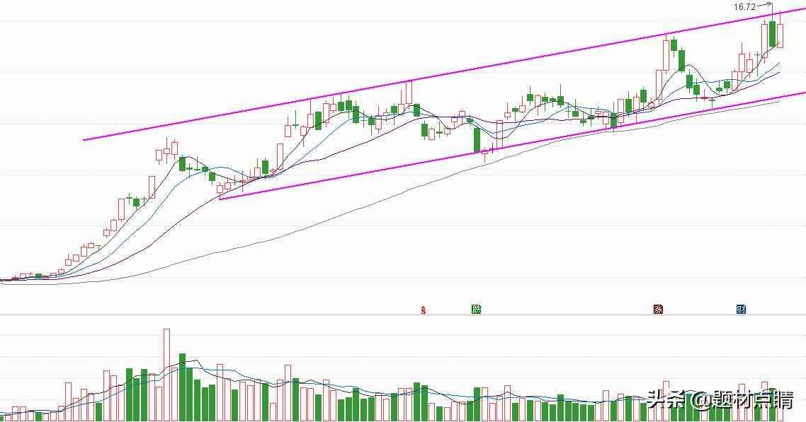 以图表分析,股价经过一段时间的强势上涨,形成一个上升通道形态,并长时间在通道内震荡上涨,当前股价仍在通道内运动。笔者认为,以当前的股价所处的阶段与形态分析,目前还不适合用大仓位进行交易,可以动用小仓位在通道内进行高抛低吸短线交易,但有个前提是股价不能有效跌破通道下轨支撑下,如果股价跌破下轨支撑线,有可能股价进入深度回调或趋势反转中。什么时候可以增加仓位呢,那就是股价放量突破通道上轨压力线,并创16.72新高的时候,那时候我们就可以积极的调整持有的仓位了。控制好风险!!
