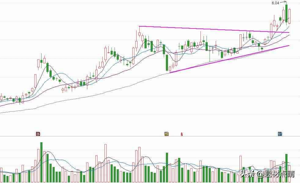以上图表分析,股价经过一轮上涨,在接近顶部的位置形成一个收缩三角形形态,当前已突破形态上方压力线并进行回踩确认。笔者认为,此时我们该先动用一部分仓位进行参与其中,等待股价再次突破新高6.04时候在增加仓位,至于风险控制,我们选择在三角形形态下轨支撑线,如果不破,我们继续持有股票,如果跌破,我们该轻仓出来观察后市走势再重新制定交易计划。控制好风险!!