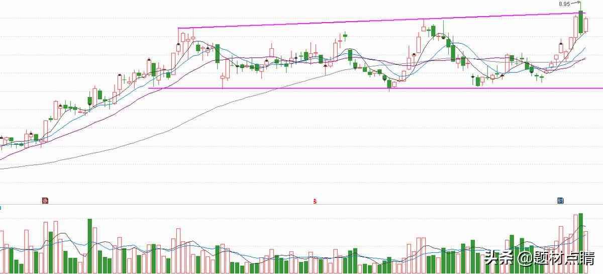 以上图表分析,股价经过一轮上涨,在顶部的位置形成一个接近于箱体的扩散三角形形态,并经过长时间在其区间来回运动,当前股价正尝试放量突破形态上方压力线,最高价达8.95,但目前股价仍处在形态区间内。笔者认为,先动用小仓位进行交易,如果股价在形态区间内来回运动,那我们就采用高抛低吸短线的策略,如果股价放量有效突破形态上方压力线,那我们可以积极调整仓位参与其中。控制好风险!!