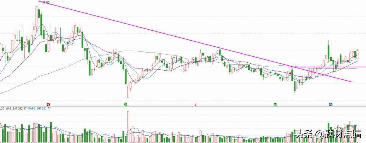 以上图表分析,股价经过一轮上涨,形成一个收缩三角形形态,并长时间在其区间来回震荡,当前股价已强势突破上方压力线,并持续的上涨创新高。笔者认为,以当前股价所处的阶段,不适合介入,仍需等待回调至形态上方支撑线附近再进行介入,风险控制线依然在三角形形态下方支撑线。控制好风险!!