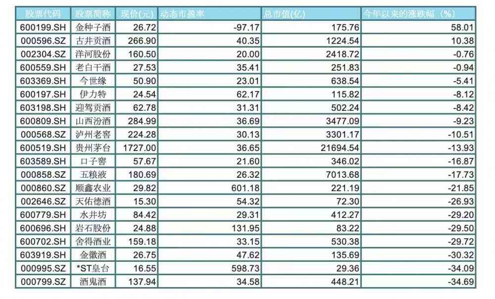 下跌企业18家,酒鬼酒、*ST皇台、金徽酒分别为-34.69%、-34.09%、-30.32%,列跌幅前三位。泸州老窖、贵州茅台、五粮液分别以-10.41%、-13.93%、-17.73%,列涨幅第九、第十、第十二名。