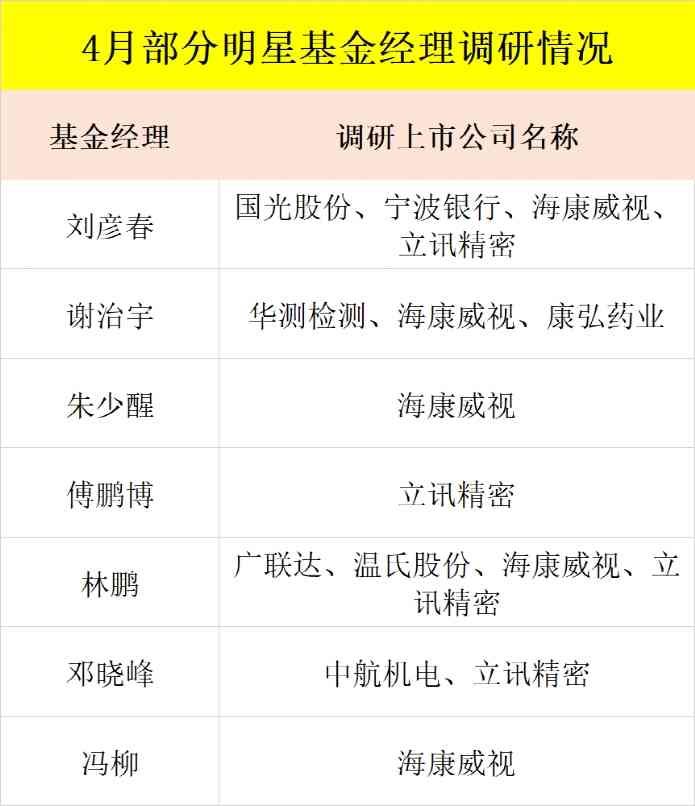傅鹏博、刘彦春、归凯等顶流公募基金经理以及邓晓峰、林鹏等百亿私募大佬4月调研了多家上市公司,立讯精密和海康威视被其中多位基金经理相中,还有一些细分龙头股也值得关注。