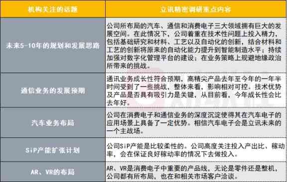 关于未来5-10年的规划和发展思路,立讯精密表示,公司所布局的汽车、通信和消费电子三大领域拥有巨大的发展空间。在此情况下,公司着重在技术性问题上投入精力,包括基础研究和材料、工艺以及自动化的创新,结合材料和工艺的创新将原来的自动化能力提升到智能制造水平;持续加强对数字化管理平台的建设;在业务策略上规避地缘政治所带来的挑战。