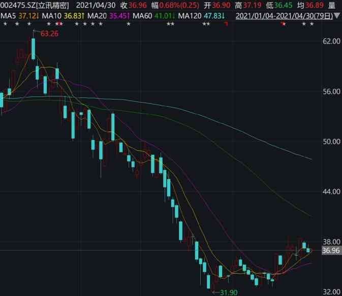 立讯精密的股价在今年1月14日涨至阶段高点63.26元/股,但随后开启暴跌模式,到3月25日跌至31.90元/股,股价出现了腰斩。近期立讯精密有所反弹,4月30日报收36.96元/股,较此前高位跌了42%左右,最新总市值为26亿元。