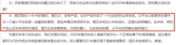 而关于市场关注的萤石网络的业务方向和后续发展,海康威视表示,萤石在做智能锁、扫地机器人,也在做控制等,云平台的规模越来越大。