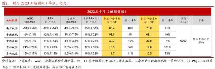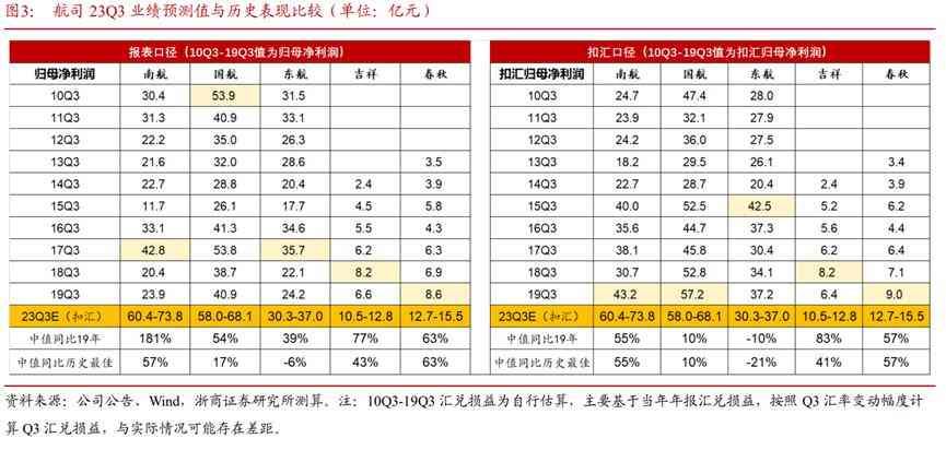 Q3扣汇归母净利润口径下,我们预计南航为60.4-73.8 亿 元,国航为58.0-68.1 亿元,东航为30.3-37.0 亿元,吉祥为10.5-12.8 亿元,春秋为 12.7-15.5 亿元,区间中值同比 19 年(扣汇)分别+55%、+10%、-10%、 +83%、+57%,同比历史最佳水平(扣汇)分别+55%、+10%、-21%、 +41%、+57%。