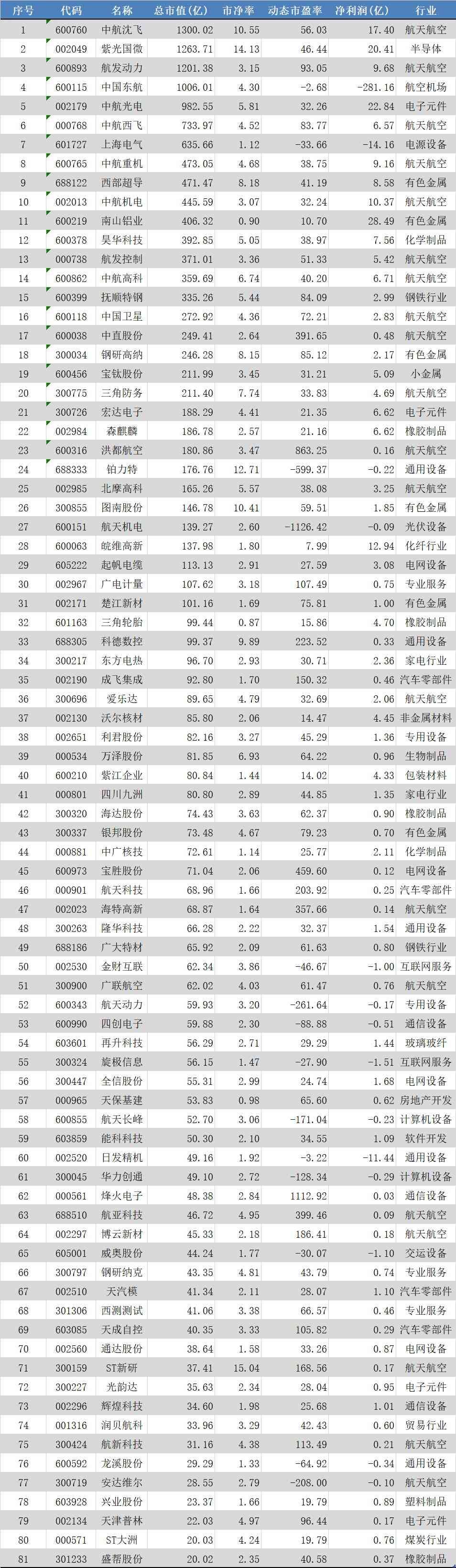在A股市场中,共有81只国产大飞机概念股,其中前10大龙股是: