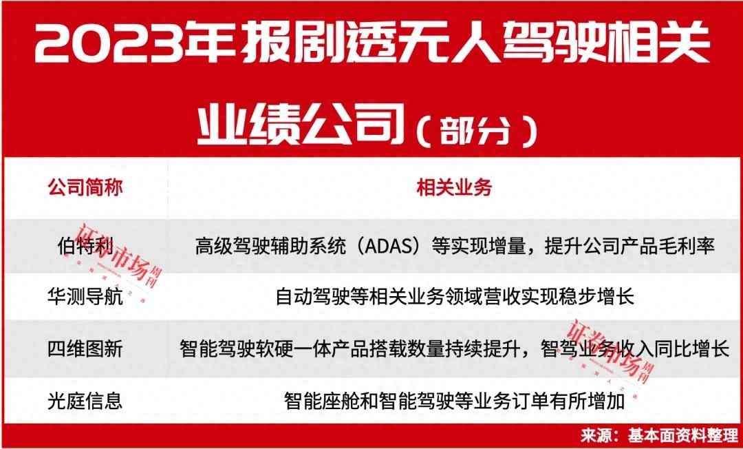 此外,仍以2023年报的角度来看,还有不少公司表示无人驾驶相关业务贡献了业绩或实现增长。比如伯特利、华测导航、四维图新、光庭信息、经纬恒润等。详细情况大家可查看下方表格内容。