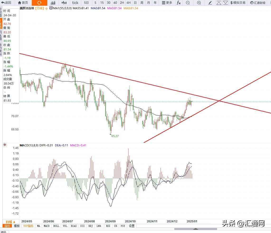 且均线缓慢上移,MACD指标继续走高,不排除再次测试下降趋势线的可能性,而基本面上,因美欧冬季供暖需求回升,推动油价走强。