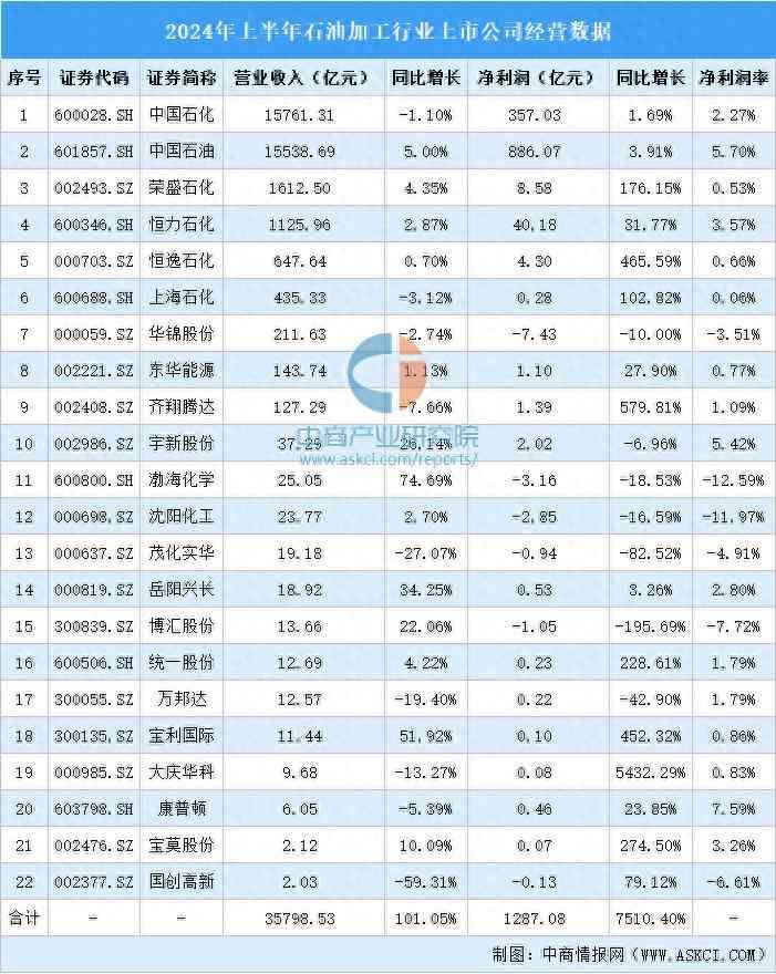 石油股十大龙头企业排名,2024年上半年中国石油加工行业上市公司业绩排行榜