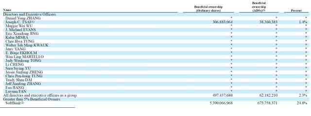 截至2020年7月2日,阿里巴巴创始人马云持股降至4.8%,蔡崇信持股降至1.6%。软银持股降至24.9%。